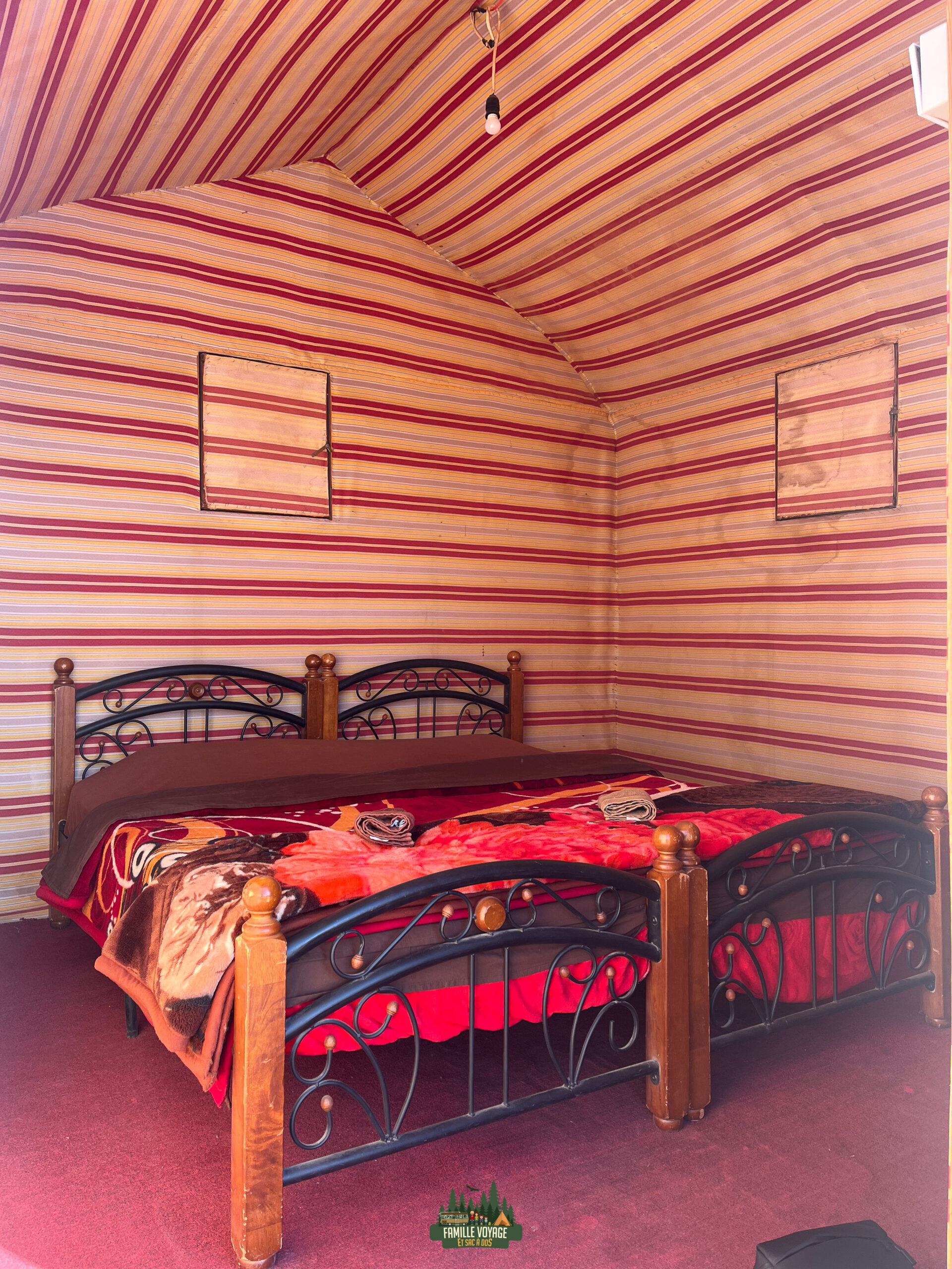 Ce campement regroupe pas moins de 11 tentes deux personnes, de notre côté, nous avons réservé une tente avec un lit double et une tente avec deux lits simple.